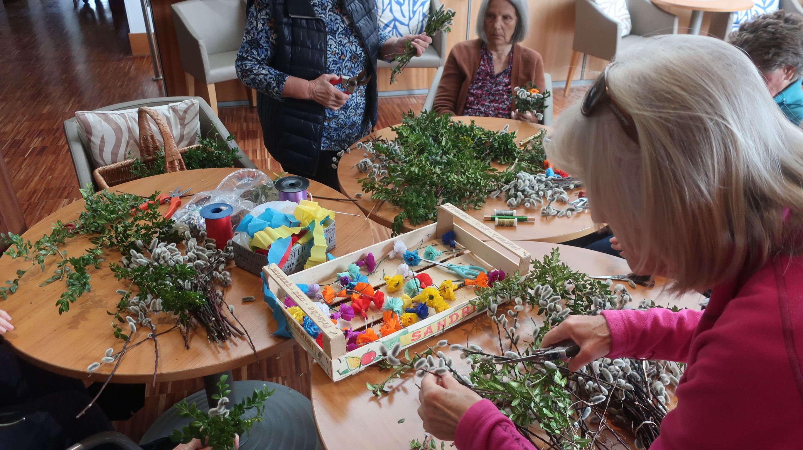 Auch dieses Jahr treffen wir uns am Freitag vor der Karwoche in unserer Cafeteria, um gemeinsam Palmbuschn zu binden. Frau Reupert, eine unserer Betreuungsassistentinnen, hat schon vor einiger Zeit begonnen, viele bunte Papierblumen mit den Bewohner*innen zu basteln. Das ist eine der wichtigsten Voraussetzungen für den alten bayrischen Brauch.