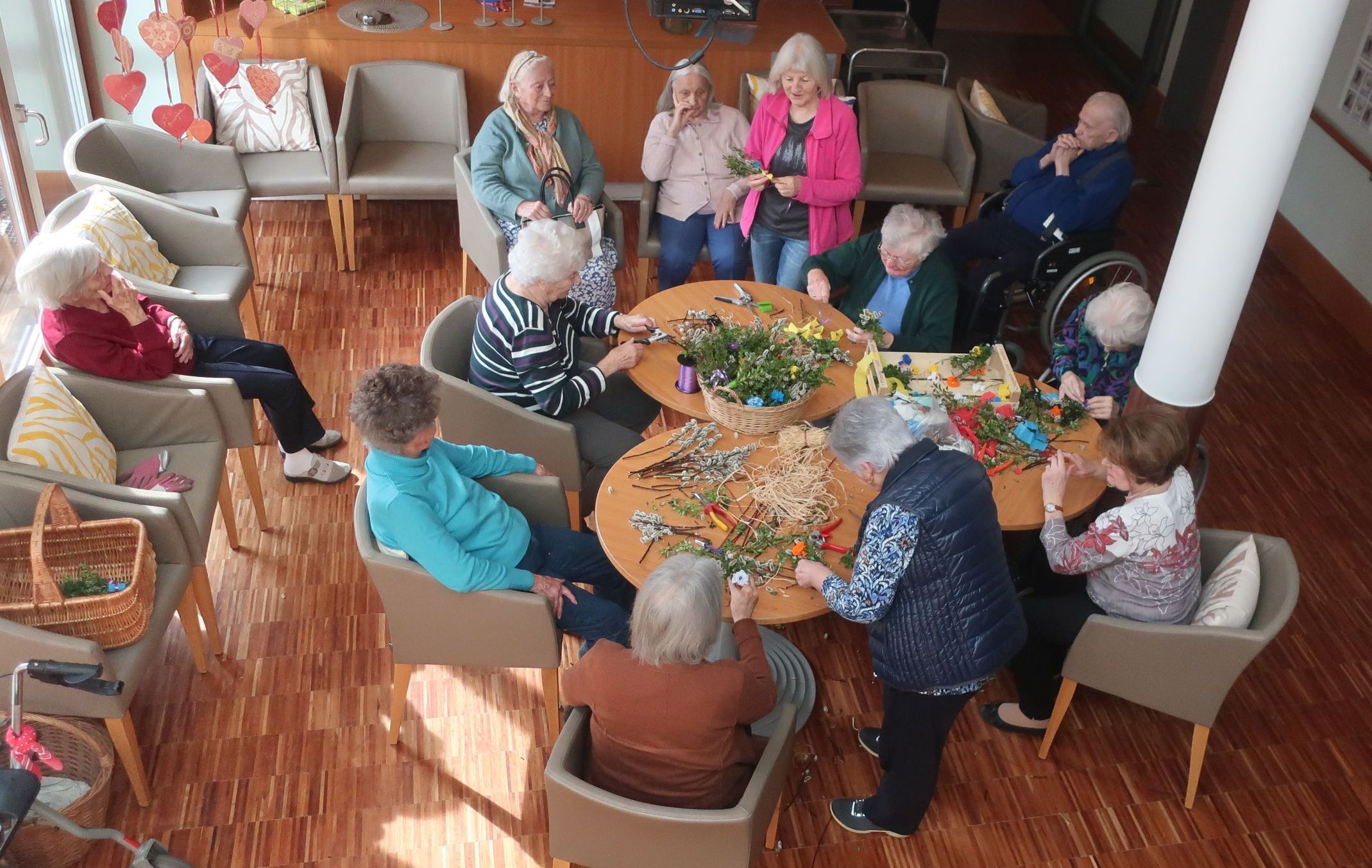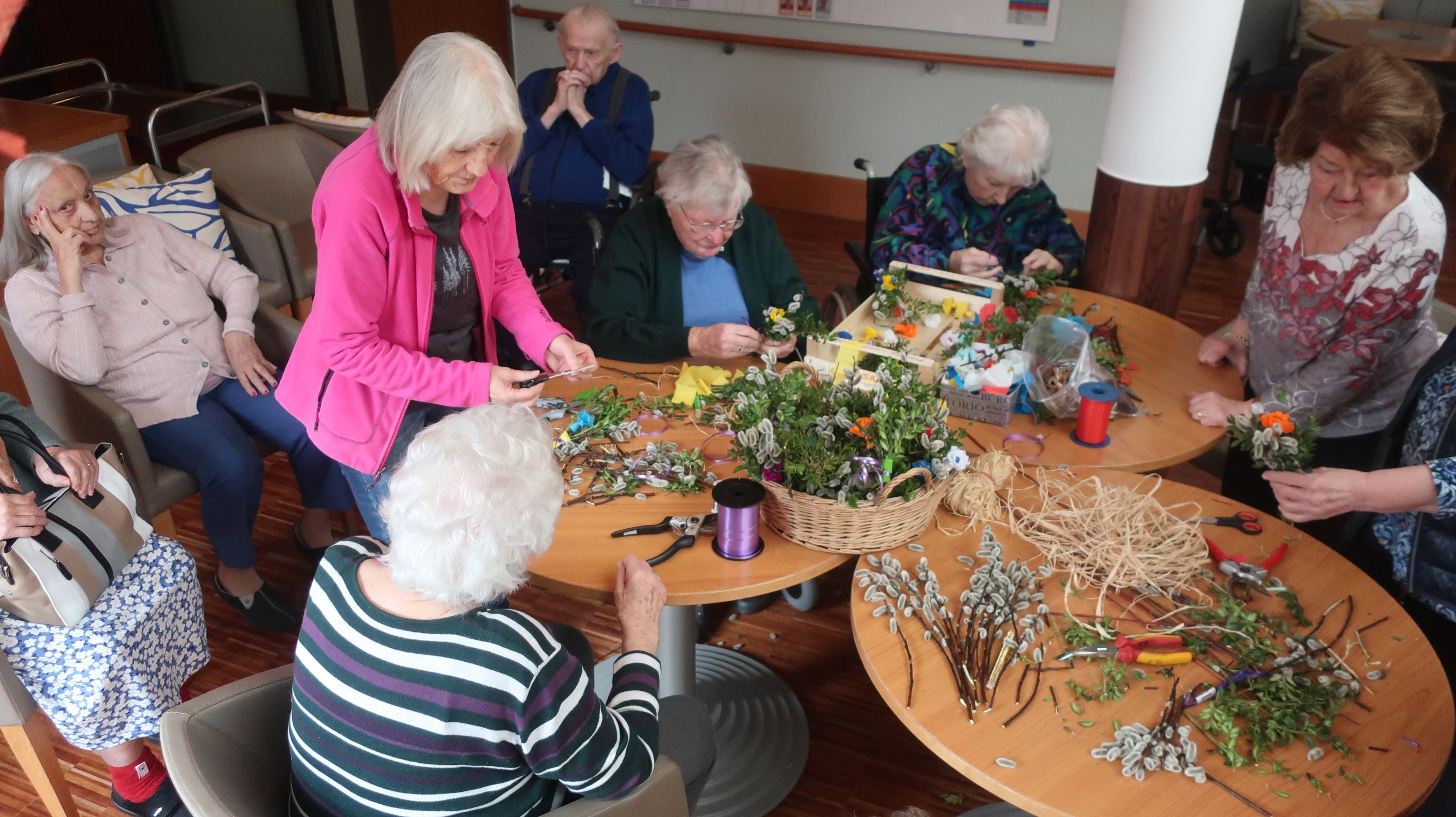 Viele, noch fitte Bewohner können Frau Rawiel und Frau Huber, unsere lieben ehrenamtlichen Helfer*innnen, tatkräftig beim Binden unterstützen, sodass am Ende ca. 40 Stück der putzigen Sträuße entstanden sind. Einige aus dieser Generation kennen noch diese alte Tradition von ihrer Kindheit und es hat damals meist die Vorfreude auf das Osterfest gesteigert. Heute ruft es Vergangenes wieder hervor. Außerdem macht das "Werkeln" in der Gemeinschaft Spaß und die Bewohner*innen sind stolz, was sie heute noch alles schaffen und selber erstellen können.