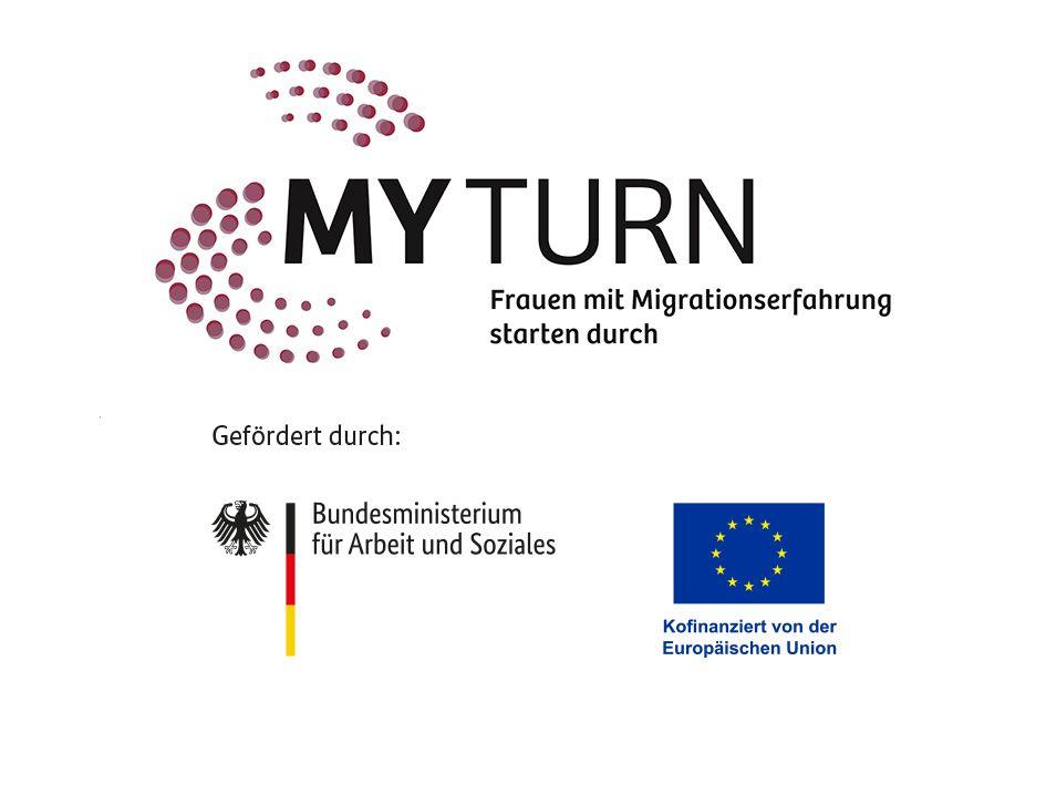 Das Projekt „MY TURN – Ich bin dabei! “ in Landsberg wird im Rahmen des Programmes „MY TURN-Frauen mit Migrationserfahrung starten durch" durch das Bundesministerium für Arbeit und Soziales und die Europäische Union über den europäischen Sozialfonds Plus (ESF Plus) gefördert.